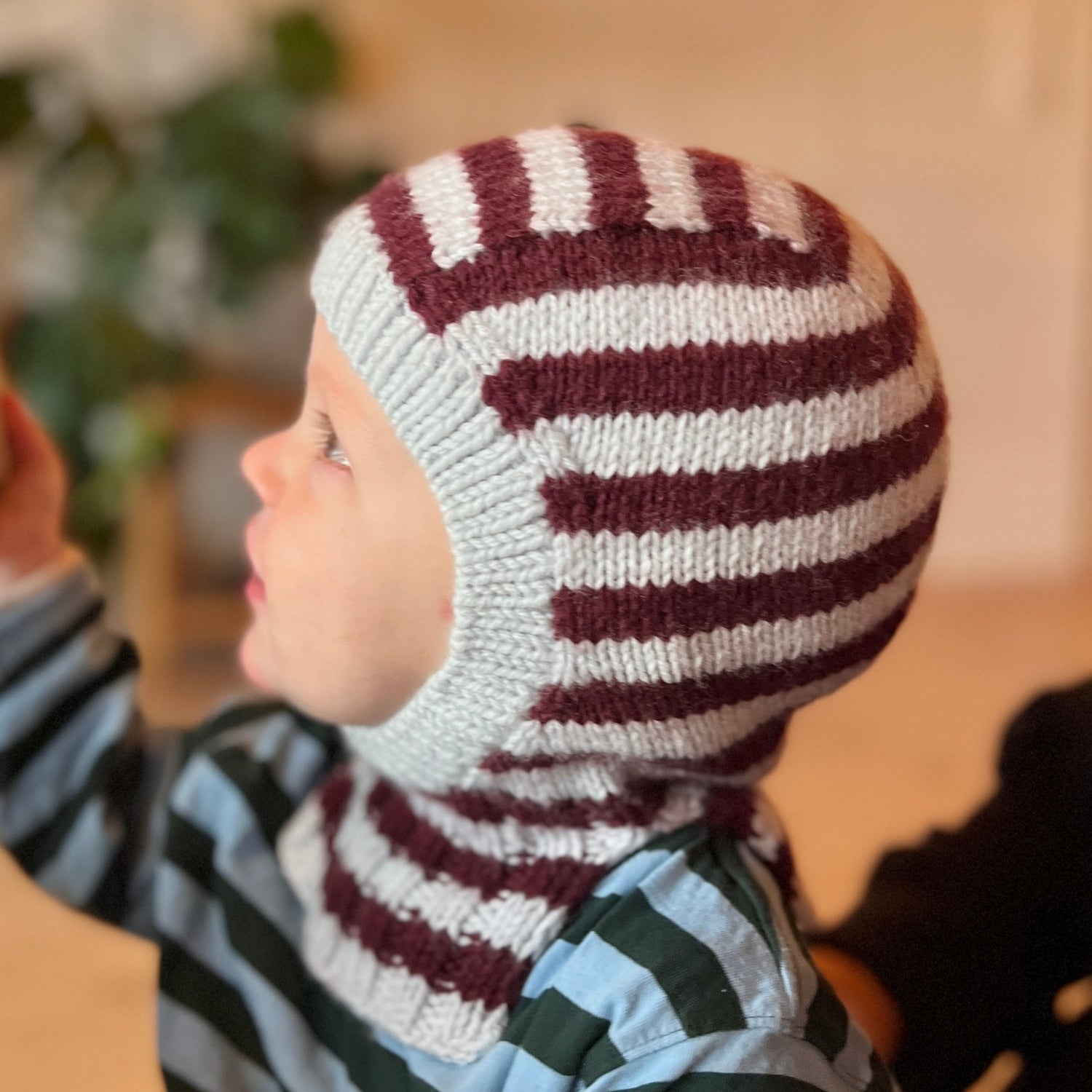 En tykk stripete balaklava er deilig til vintersesongen. Smau balaklava er formstrikket og sitter godt rundt hodet i ansiktet.