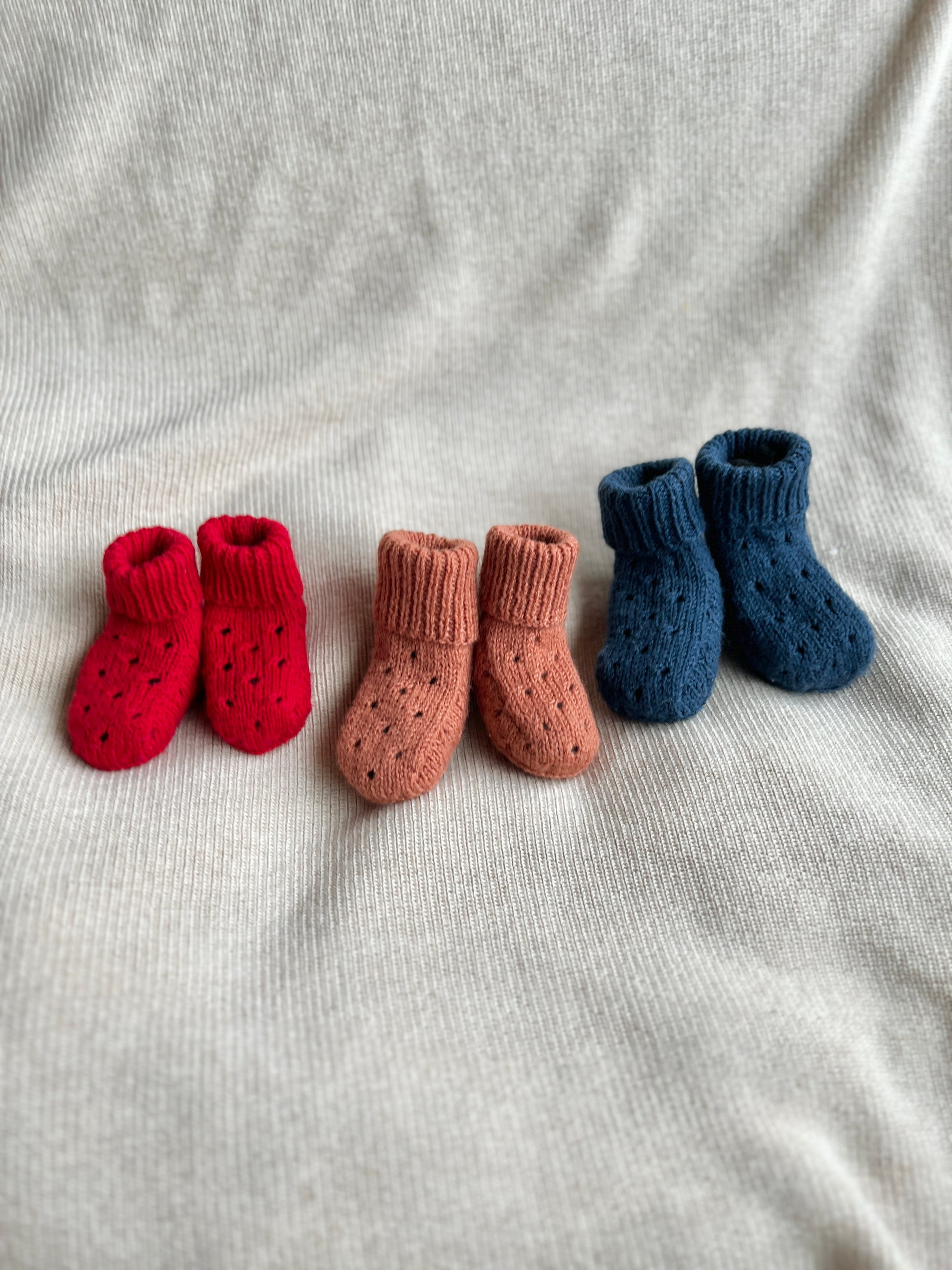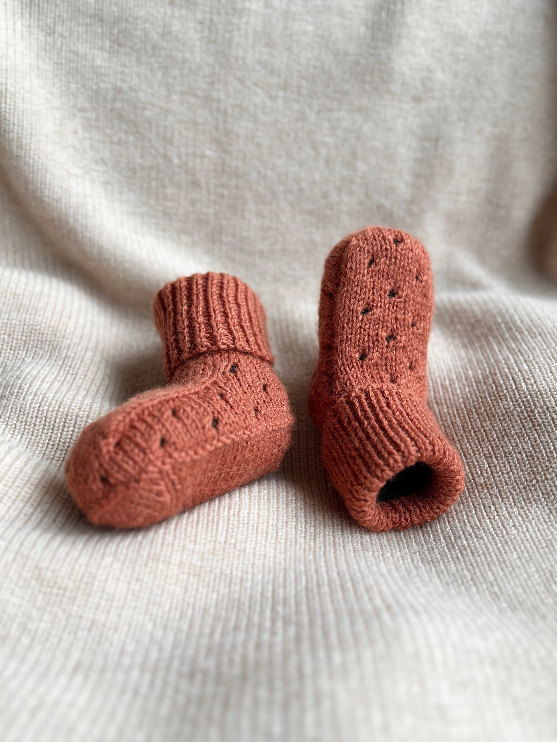 The Raindrop series is knitted in a simple hole pattern, giving it both a clean and playful look. The series includes a coming home set with a bonnet (sold separately), a onesie, a balaclava – and now booties. We hope you’ll get just as hooked on them as we are when filling the gift basket!