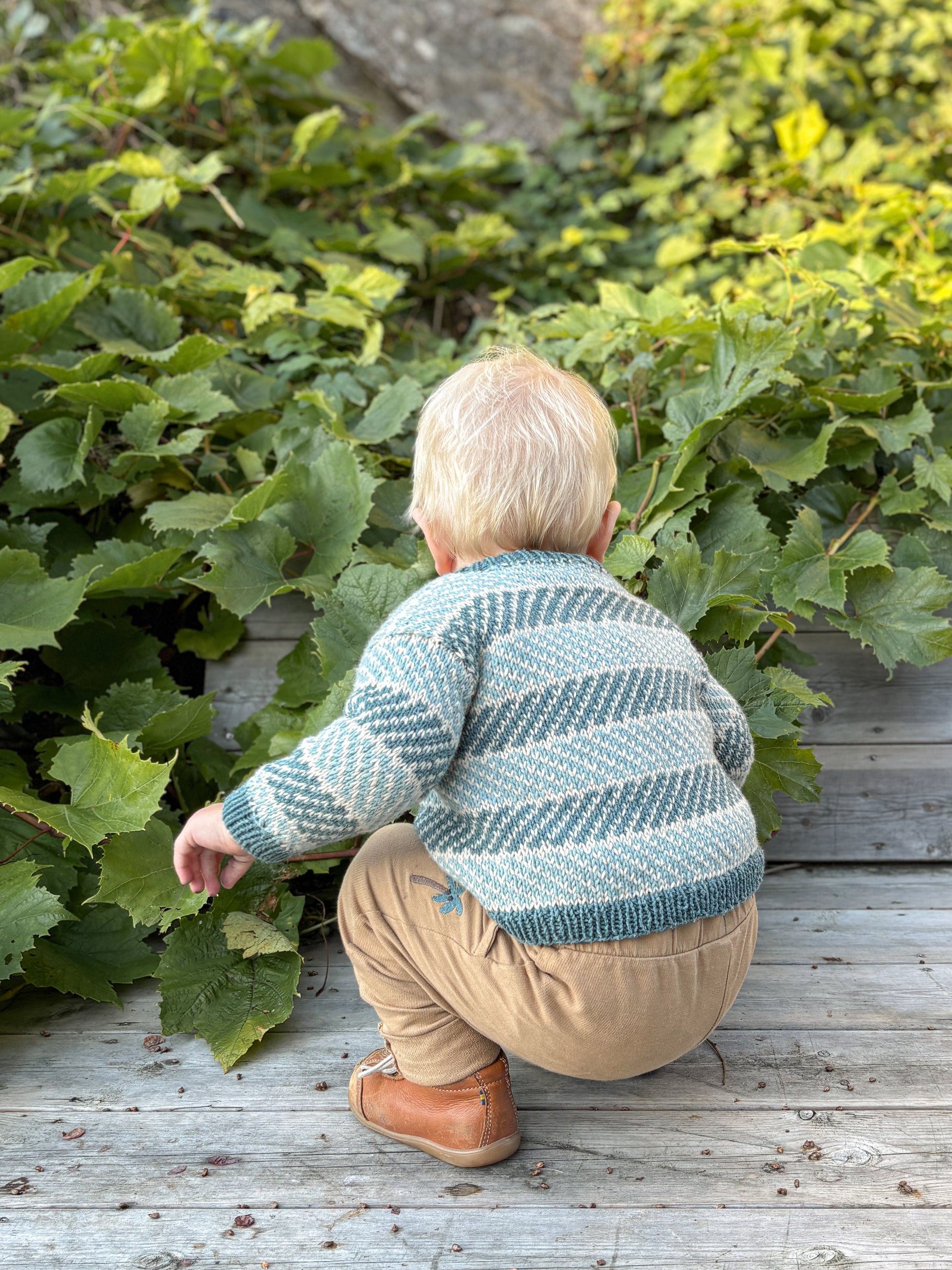 Tippetue sweater is a warm sweater named after one of the trails winding up Fløyfjellet in Bergen. The sweater is knitted bottom-up, with picked-up stitches for the sleeves. The shoulders are grafted using Kitchener stitch, and the neckline can be finished as either a single-layered or a double-layered collar that is folded down and sewn in place. The sweater is knitted in a main color with two stripe colors, or you can use leftover yarn and knit stripes in different colors.